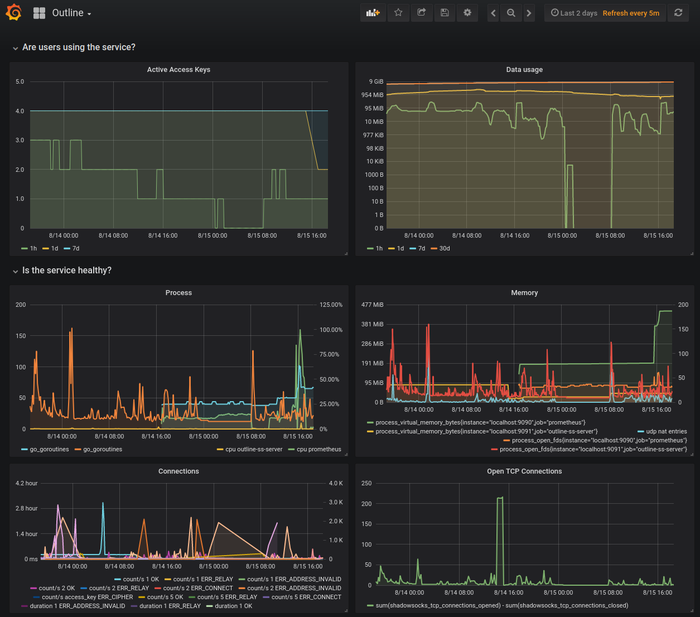 Отличия outline-ss-server от go-shadowsocks2 сводятся к поддержке подключения нескольких пользователей через один сетевой порт, возможности открытия нескольких сетевых портов для приёма соединений, поддержке горячего перезапуска и обновления конфигурации без разрыва соединений, встроенными средствами мониторинга и измерения трафика на базе платформы prometheus.io.