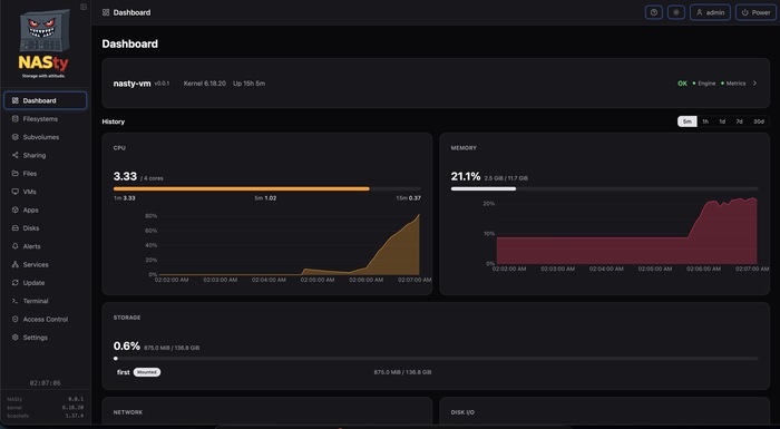 Дополнительно можно отметить выпуск проекта NASty 0.0.3, развивающего дистрибутив для создания сетевых хранилищ (NAS) на основе типового оборудования. Дистрибутив построен на пакетной базе NixOS, использует файловую систему Bcachefs и поддерживает предоставление доступа к файлам через NFS и SMB, а также экспорт блочных устройств через iSCSI и NVMe-oF. Управление осуществляется через web-интерфейс. Размер установочного iso-образа 1.9 ГБ. Наработки проекта распространяются под лицензией GPLv3. Web-интерфейс написан на TypeScript с задействованием фреймворка SvelteKit. Движок для управления хранилищем и системой написан на языке Rust.