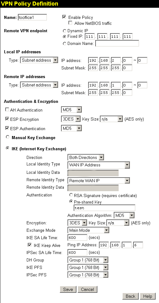 spdadd 192.168.1.0/24 192.168.2.0/24 any -P out ipsec esp/tunnel/111.111.111.111-222.222.222.222/require;