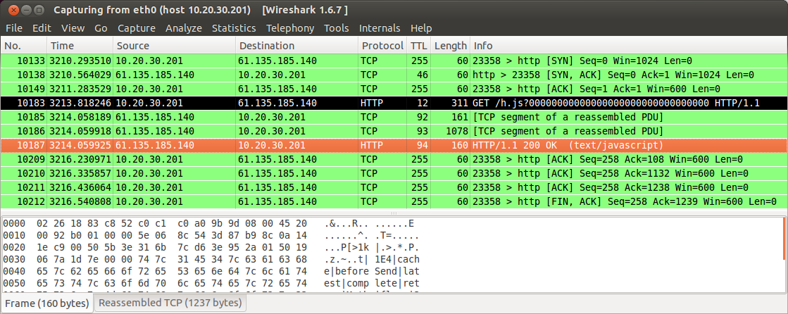 Для определения точки подстановки трафика был использован довольно интересный метод, основанный на анализе изменения TTL (https://ru.wikipedia.org/wiki/Time_to_live) (поле в заголовке IP-пакета, уменьшаемое на единицу на каждом транзитном маршрутизаторе). Ранее, изучая атаку на GitHub, исследователи из компании Netresec обнаружили (http://www.netresec.com/?page=Blog&month=2015-03&post=China&... важные особенности работы с TTL на перехватывающем трафик MITM-узле. Подмена осуществлялась только для пакетов с низким TTL ("пришедших издалека"), а подменённые в результате MITM-атаки пакеты снабжались с аномальном большим TTL, т.е. значение данного поля искусственно заменялось на большое значение, что явно выделяло прошедшие через MITM-прокси пакеты в общем потоке ответов от сервера.В ситуации с осуществляющем атаку на GitHub MITM-прокси, проверочные пакеты к серверу Baidu, отправленные с TTL 64, достигают целевого хоста при TTL 46, т.е. по пути наблюдается 18 транзитных шлюзов. Но после отправки web-запроса, ответ приходит с TTL 98 или 99, что можно использовать как сигнал получения ответа от подставного сервера. Роберт Грэм решил воспользоваться данной аномалией и проследить на каком узле в цепочке передачи пакета происходит изменение TTL. Для этого им был подготовлен модифицированный вариант утилиты traceroute, отправляющий HTTP-запросы с изменённым TTL и отслеживающий пакеты об исчерпании времени жизни от маршрутизаторов.