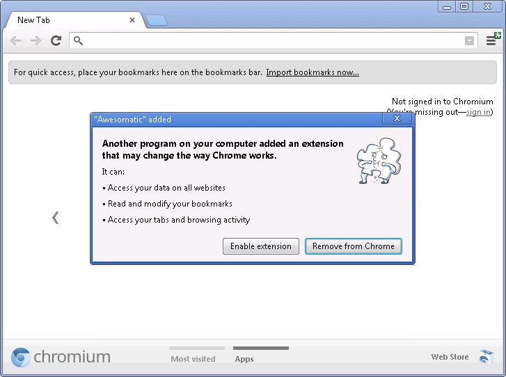 Вторым важным изменением является обеспечение (http://blog.chromium.org/2012/12/no-more-silent-extension-in...) автоматического отключения дополнений, установленных без ведома пользователя. Данная функция реализована только для платформы Windows, на которой стало обычным делом, когда при установке определённого приложения, данное приложение молча устанавливает своё дополнение к Chrome. При обнаружении попыток установки дополнений без спроса, пользователю теперь выводится предупреждение с предложением активировать или удалить дополнение. Все дополнения которые были установлены ранее будут по умолчанию отключены и отображены специальным списком для принятия решения по их дальнейшему использованию.<center><a href="http://2.bp.blogspot.com/-nolnJXOTvg4/UNS8bQCiCcI/AAAAAAAAAs... src="http://www.opennet.me/opennews/pics_base/0_1361515770.png" style="border-style: solid; border-color: #e9ead6; border-width: 15px;" title="" border=0></a></center>