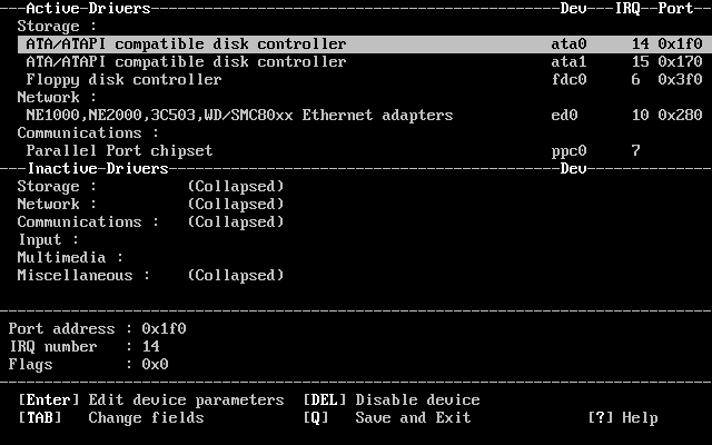 Для изменения IRQ и адреса порта ввода-вывода драйвера, выберите устройство и нажмите Enter. Курсор переместится в третье окно и вы сможете изменить значения. вам нужно ввести значения IRQ и адреса порта, определенные в процессе сбора информации об оборудовании. Нажмите Q для завершения редактирования конфигурации устройства и возвращения в список активных устройств.