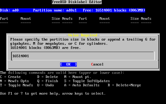 Если вы будете удалять существующий слайс для освобождения места под FreeBSD, выберите слайс, используя клавиши навигации, и нажмите D. Затем можете нажать C, и получить приглашение на ввод размера слайса, который вы хотите создать. Введите соответствующее значение и нажмите Enter. Значение по умолчанию в этом поле означает наибольший размер слайса, который может быть выбран; это может быть наибольший непрерывный блок неразмеченного пространства или размер всего жесткого диска.