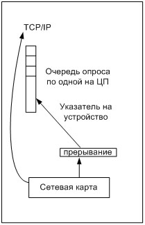 При инициализации драйвера память для входящих пакетов будет выделена статически, и в будущем никто не сможет использовать её, пока работает драйвер. Необходимость такого подхода обусловлена тем, что если сетевая карта будет работать в режиме опроса или отложенных прерываний, о которых речь пойдет чуть ниже, то ей придется последовательно принимать несколько пакетов и размещать их в памяти без уведомления об этом событии центрального процессора (ЦП). А раз так, то и место, куда будут складываться пакеты, должно быть заранее подготовлено.
