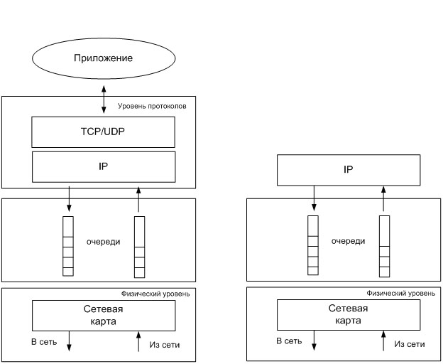 После того, как пакет был получен сетевой картой, он поступает на обработку в ядро, в IP модуль, где решается его дальнейшая судьба. Как уже было упомянуто выше, на уровне протокола происходит маршрутизация пакета, поэтому приходящий пакет будет либо переправлен дальше, минуя уровень приложения, либо передан выше по стеку. Связь IP модуля с физическим уровнем, т.е. с сетевой картой, осуществляется при помощи двух очередей. Одна из них называется backlog и служит для входящих пакетов, другая - txqueue, для исходящих [2].