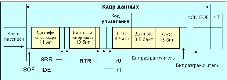 Рис. 4.1.4.2. Расширенный информационный кадр 2.0b CAN Однобитовое субполе SRR (substitute remote request) включено в поле арбитража (идентификатора кадра) и всегда содержит код 1, что гарантирует преимущество стандартного информационного кадра (2.0a) случае его соревнования с расширенным кадром (2.0b) (при равных 11 битах идентификатора). Субполе IDE (identifier extension) служит для идентификации расширенного формата и для этого типа кадра всегда имеет уровень логической 1. Вслед за IDE следует 18-битовое поле (биты имеют имена id-17, ..., id-0; первым передается бит id-28) расширения идентификатора кадра. Контроллеры 2.0b полностью совместимы с кадрами 2.0a и могут посылать и принимать пакеты обоих типов. Идентификаторы в пределах одной сети должны быть уникальными. Следует иметь в виду, что 18-битное поле расширения идентификатора можно при определенных условиях использовать и для передачи информации. Идентификатор не является адресом места назначения, а определяет назначение передаваемых данных (адресация по содержанию). По этой причине пакет может быть принят отдельным узлом, группой узлов, всеми узлами сети или не воспринят вообще. Предельное число различных идентификаторов для версии 2.0a составляет 2032, а для 2.0b превышает 500 миллионов. Послав кадр-запрос другому узлу, отправитель может затребовать присылку определенной информации. Удаленный узел должен откликнуться информационным кадром с тем же идентификатором, что и запрос. Если несколько узлов начнут передачу одновременно, право передать кадр будет предоставлено узлу с более высоким приоритетом, который задается идентификатором кадра. Механизм арбитража гарантирует, что ни информация, ни время не будут потеряны. Если одновременно начнется передача запроса и информационного кадра с равными идентификаторами, предпочтение будет дано информационному пакету. В процессе арбитража каждый передатчик сравнивает уровень передаваемого сигнала с реальным уровнем на шине. Если эти уровни идентичны, он может продолжить передачу, в противном случае передача прерывается и шина остается в распоряжении более приоритетного кадра. Протокол can имеет развитую систему диагностики ошибок. В результате вероятность не выявленной ошибки составляет менее 4.7╢ 10-11. При выявлении ошибки кадр отбрасывается и его передача повторяется. Число узлов, подключенных к каналу, протоколом не лимитируется. Практически такое ограничение налагается задержкой или предельной нагрузкой канала. Любой модуль can может быть переведен в пассивный режим ("состояние сна"), при котором внутренняя активность прекращается, а драйверы отключаются от канала. Выход из этого режима возможен либо по внутренним причинам, либо вследствие сетевой активности. После "пробуждения" модуль ждет, пока стабилизируется его внутренний тактовый генератор, после чего производится синхронизация его работы с тактами канала (11 тактов). Благодаря синхронизации отдельные узлы не могут начать передачу асинхронно (со сдвигом на часть такта). Протокол предусматривает использование четырех типов кадров:
