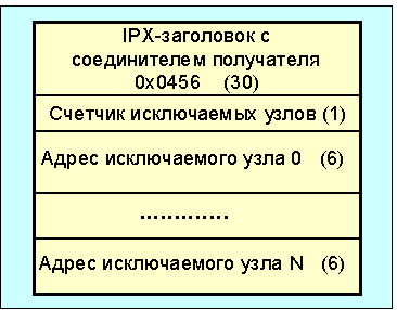 Рис. 4.2.1.5.1. Формат пакетов "Фрагментированный NDS-запрос/отклик" Диагностические запросы содержат код 0x0456 в поле соединителя получателя IPX-заголовка. Формат такого запроса показан на рис. 4.2.1.5.2. Однобайтовое поле счетчика исключаемых узлов задает число станций, которые могут не присылать отклик. Нуль в этом поле предполагает, что все станции должны откликнуться. Допустимый диапазон значений кодов в этом поле 0 - 79. При широковещательной рассылке запроса можно сделать так, чтобы сервер и определенные клиенты на запрос не реагировали. Для этого их адреса помещаются в поля адресов исключаемых узлов. Число таких исключений может достигать 80.