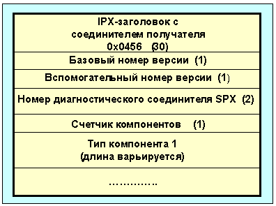 Рис. 4.2.1.5.2. Формат диагностического запроса Структура пакета-отклика показана на рис. 4.2.1.5.3. В зависимости от числа компонентов конфигурации пакет-отклик может иметь различную длину. Поля базового и вспомогательного номера версии характеризуют вариант программы diagnostic responder (например, 1.1). Поле номер диагностического соединителя SPX указывает на соединитель, которому отсылаются все диагностические отклики. Поле счетчик компонентов содержит число описаний компонентов, содержащихся в пакете. Поле тип компонента описывает один из компонентов (или процессов) узла, посылающего отклик. Описание компонента может быть простым и расширенным. Простое описание содержит один байт идентификатора компонента. Расширенное описание компонента включает в себя информацию о маршрутизаторах, файл-серверах и невыделенных IPX/SPX. Первое поле в этом случае представляет собой идентификатор расширенного описания, который характеризует тип компонента: Таблица 4.2.1.5.1. Коды типа компонентов