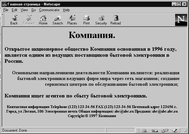 <HTML> <HEAD> <TITLE> Главная страница</TITLE> </HEAD> <BODY> Компания. Открытое акционерное общество Компания основанная в 1996 году, является одним из ведущих продавцов бытовой электроники в России. Ос-новными направлениями деятельности Компании являются: реализация бытовой электроники ведущих фирм мира через сеть магази-нов; создание сервисных центров по обслуживанию бытовой электроники; Компания ищет агентов по сбыту бытовой электроники. Контактная информация Telephone (123) 123-34-56 FAX (123) 123-34-56 Почтовый адрес 123456 г. Город, ул Лесная, 106 Электронная почта Общая информация: [email protected] Продажи: [email protected] Copyright Ы 1997 Компания </BODY> </HTML>
