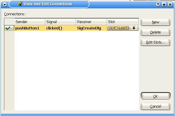 Чтобы создать соединение, нужно просто выбрать нужный сигнал (в нашем случае — clicked()) и слот (созданный нами slotCreateSig()). Когда вы выбрали сигнал и слот, вы увидите, что слева появится зеленая галочка. Теперь нажмите ОК.