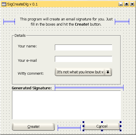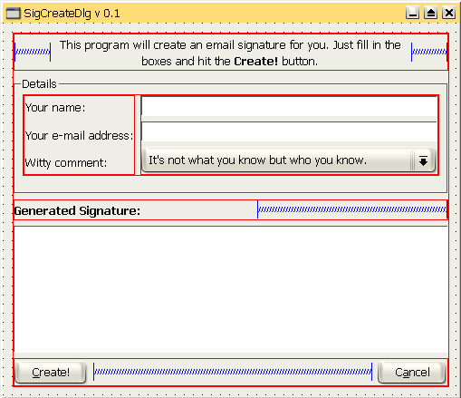 Для начала мы используем распорки для центрирования верхней надписи. Измените размер надписи так, чтобы она занимала как можно меньше места, но при этом полностью вмещала текст. Добавьте две распорки, по одной с каждого края. Для этого нажмите значок с нарисованной на нем пружиной или выберите пункт меню Layout => Add Spacer. Щелкните по пустому месту слева от надписи и выберите Horizontally. Появится синяя распорка (см. рис. 14). Повторите ту же операцию справа от надписи. Затем добавьте распорку справа от надписи 'Generated Signature' и еще одну справа от кнопки 'Create!'.