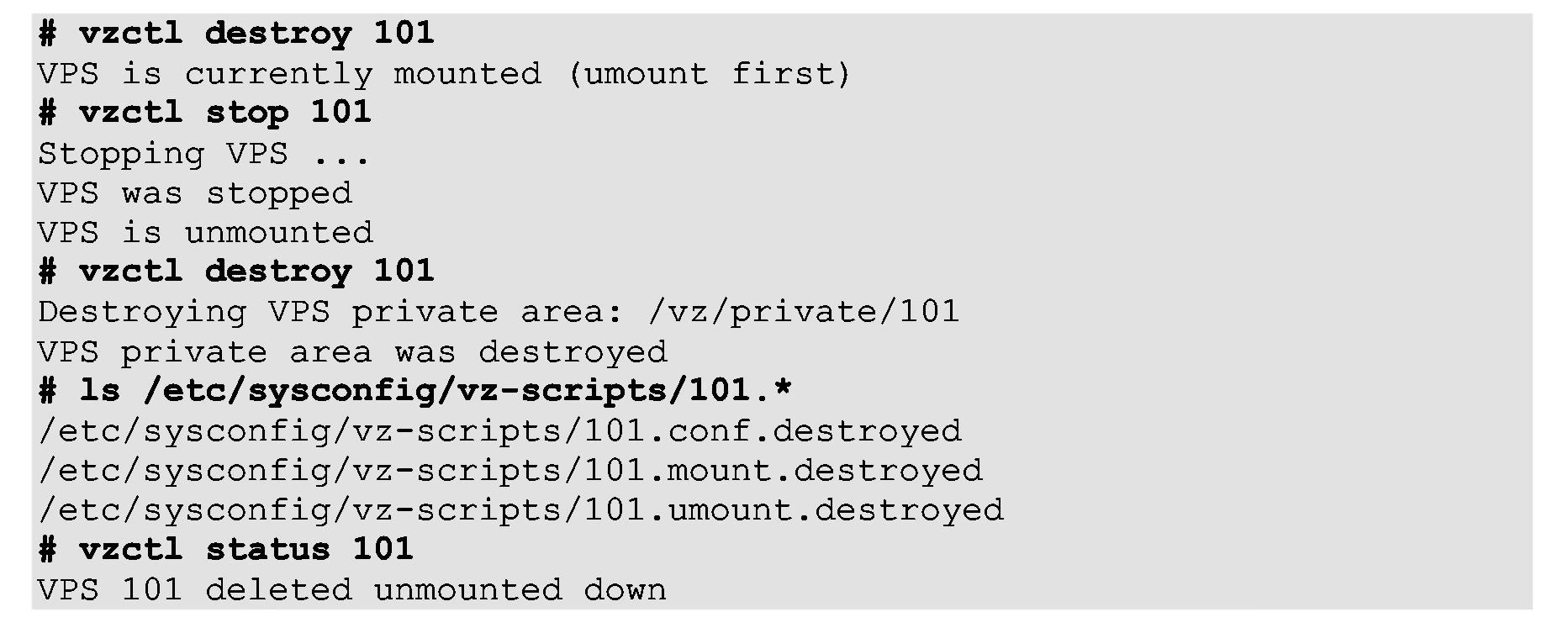 Итоговая типовая конфигурация будет создана в директории /etc/sysconfig/vz-scripts. Файл будет носит название ve-sample_name.conf-sample. Теперь Вы можете использовать sample_name как аргумент к опции - config команды vzctl create. Если образец с таким названием уже существует, утилита пошлет Вам сообщение об ошибке, она не будет заменять существующую конфигурацию.