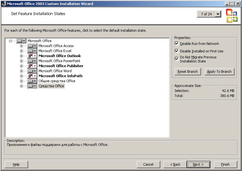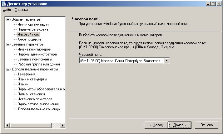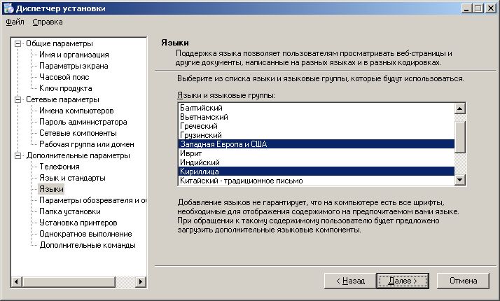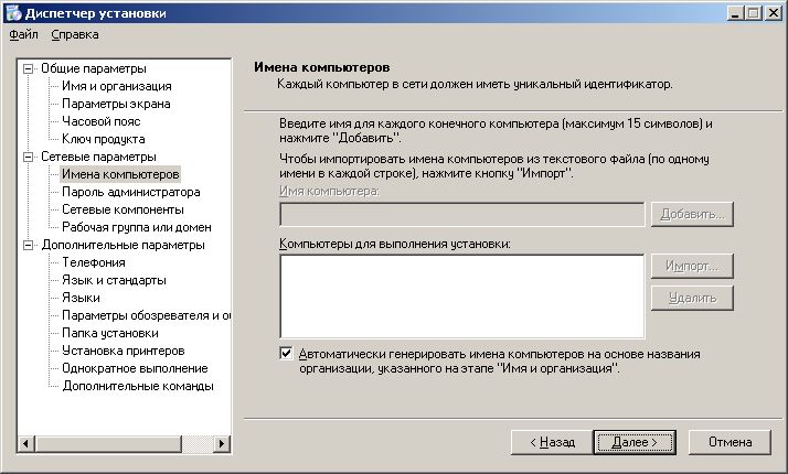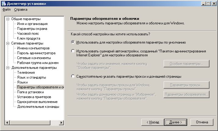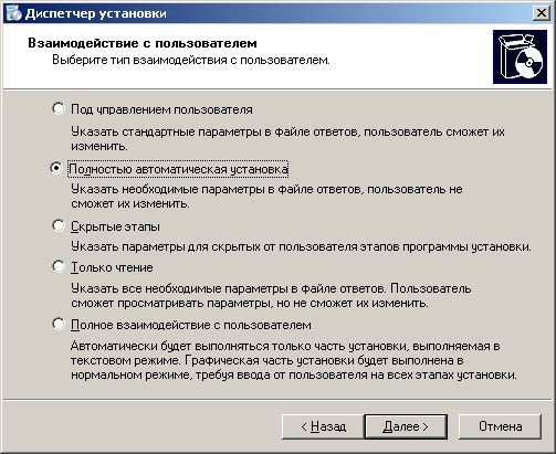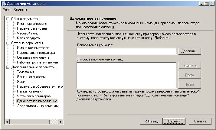 [Commands] "wscript /B off.vbs" "addon\of\setup.exe TRANSFORMS=addon\of\mtskomi.mst /qn" "addon\mz\mozilla.exe -ma -ms -ira -hideBanner" "msiexec /i addon\ar\ar.msi ALLUSERS=1 /qn" "msiexec /i addon\dn\netfx.msi ALLUSERS=1 /qn" "addon\mz\flash.exe /s" "addon\wr\winrar.exe /s" "addon\or\ora.exe" "wscript /B jdk.vbs" "addon\1c\DISK1\setup.exe /s /sms /f1addon\1c\DISK1\setup.iss" "regedit /s default.reg" "regedit /s mozilla.reg" "wsname /N:%DNS /NOREBOOT" "wscript /B welcome.vbs"Итак, мы создали дистрибутив, содержащий необходимые для работы программные продукты и средства для их автоматической установки.