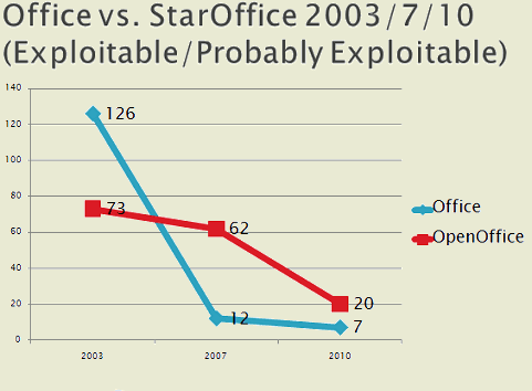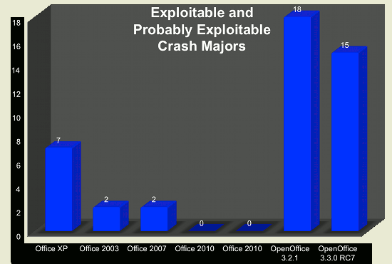 А главный вывод где? "Все найденные уязвимости OOo, благодаря его открытой природе, удалось оперативно устранить. Как пропатчить MSO - неизвестно.". Или, иначе, о чём спич? Разница в открытом и закрытом не в наличии уязивимостей, а в разницы в их закрытии. Как узнать, к чему привели эти исследования?