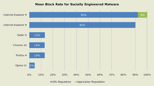>эффективность блокирования в которых составила 90% при включении режима оценки репутации URL и 100% при включении технологии учета репутации приложений в IE9