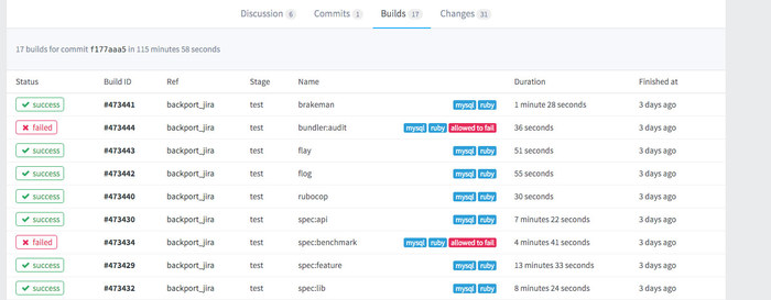 - Добавлена вкладка Builds для оценки результатов сборок в системе непрерывной интеграции, инициированных флагом проверки пересборкой запроса на изменение;