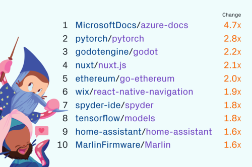 > Рейтинг наиболее быстро развивающихся репозиторев возглавляют azure-docs (4.7), pytorch (2.8x), godot (2.2x), nuxt.js (2.1x) и go-etherium (2x).