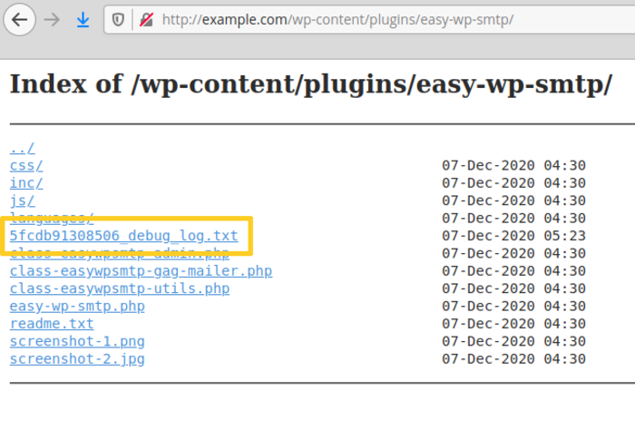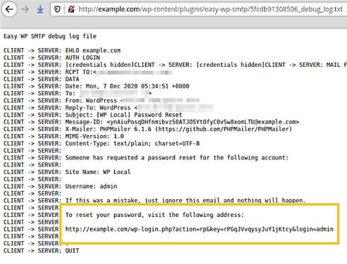 > плагин сохранял в публично доступном каталоге "/wp-content/plugins/easy-wp-smtp/" файл с отладочным логом, в котором отображалось содержимое всех отправленных писем