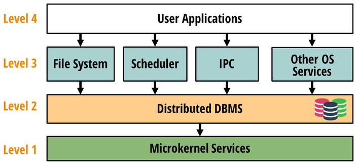 Или просто на картинку взгляните. Ниже DBMS - Microkernel services, а выше - OS services.