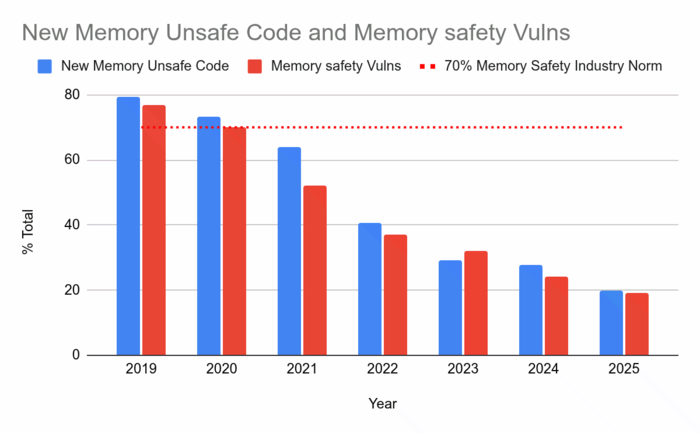 В 2025 году впервые доля уязвимостей, вызванных ошибками при работе с памятью, оказалось меньше 20% от общего числа уязвимостей. Для сравнения в 2024 году этот показатель в Android составлял 24%, а в 2019 году - 76%. При этом средний показатель по индустрии продолжает оставаться на уровне 70%.