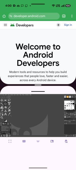 - Добавлена возможность запуска графических приложений, собранных для Linux. Запуск осуществляется через приложение Linux Terminal, позволяющее запустить в окружении Android виртуальную машину с Debian GNU/Linux, в которой можно выполнять обычные Linux-приложения. Для запуска графического окружения в приложение Linux Terminal добавлена кнопка "Display", включающая перенаправление графики через компоненты в основном окружении Android. После активации кнопки "Display" в терминале можно запустить композитный сервер Weston, предоставляющий минималистичный оконный сеанс, а затем использовать его для запуска любых графических приложений, например, продемонстрирован запуск графического редактора GIMP.