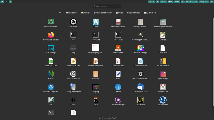 В состав дистрибутива входят программы как с графическим интерфейсом, такие как Firefox, Qutebrowser, Audacious, Transmission, Libreoffice, Pluma и MATE Calc, так и консольные приложения и утилиты, такие как музыкальный проигрыватель Musikcube, видеопроигрыватель MPV, утилита для просмотра изображений Swayimg, утилита для просмотра документов PDF Zathura, текстовый редактор Neovim, файловый менеджер Ranger и другие.