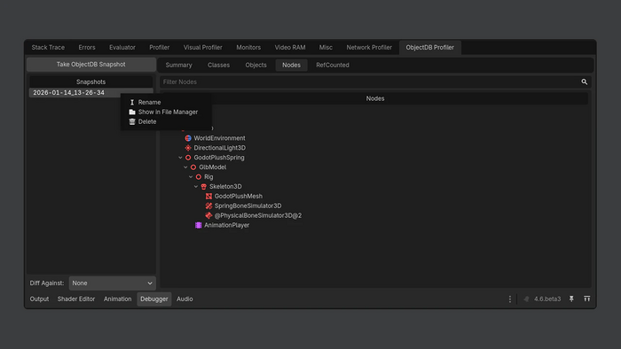 - В инструмент отслеживания объектов добавлена возможность создания снапшотов ObjectDB и сравнения срезов состояния со списками существующих объектов в определённые моменты времени.