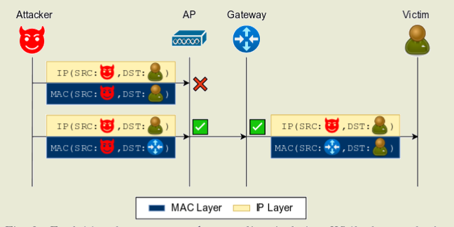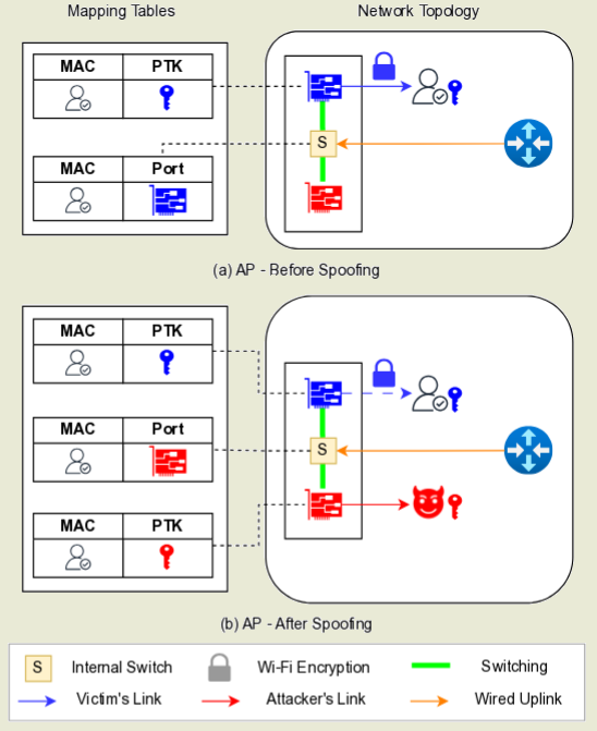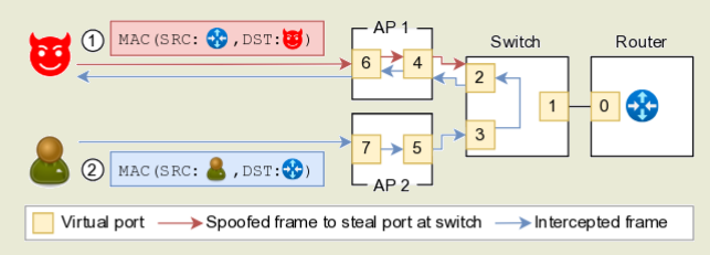 2. Если ты ставишь себе MAC как у цели, но подключаешься к той же точке доступа но на ругой диапазон то внутренний L2 свитч начнёт перенаправлять ВСЕ пакеты тебе вместо того кто первый подключился.