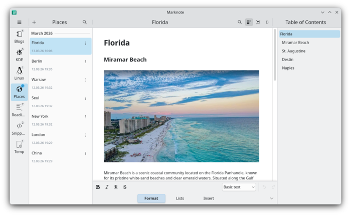• Опубликован выпуск Marknote 1.5, приложения для создания и управления коллекцией текстовых заметок, сохраняемых в формате Markdown. В новой версии помимо ранее доступного WYSIWYG-режима визуального редактирования текста, добавлен режим для работы с исходной разметкой Markdown. Также добавлена поддержка вставки ссылок между заметками, реализован полнотекстовый поиск и предложен плагин для интеграции с KRunner.