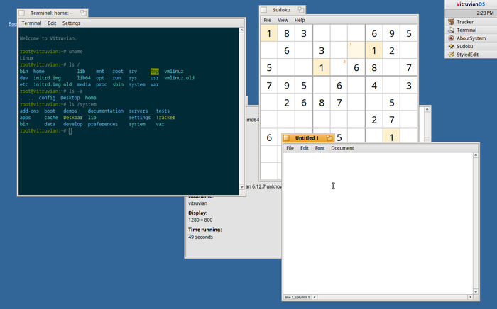 >Вместо привычных оконных менеджеров X11 и композитных серверов Wayland для вывода графики в VitruvianOS применяется app_server - графический сервер из Haiku, адаптированный для работы поверх Linux KMS/DRM.