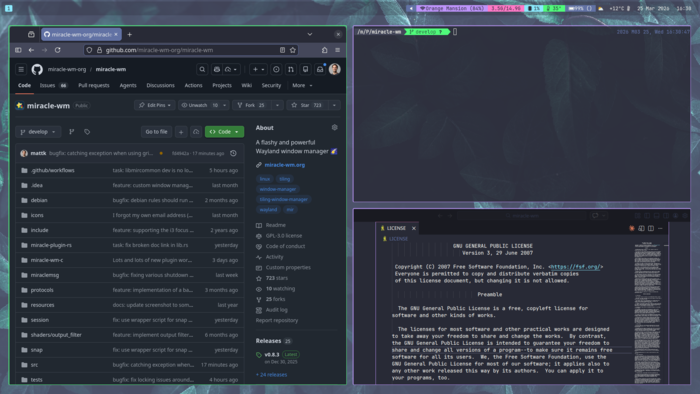 ЮЦелью miracle-wm является создание композитного сервера, применяющего мозаичное управление окнами, но более функционального и стильного, чем такие продукты, как Swayfx.