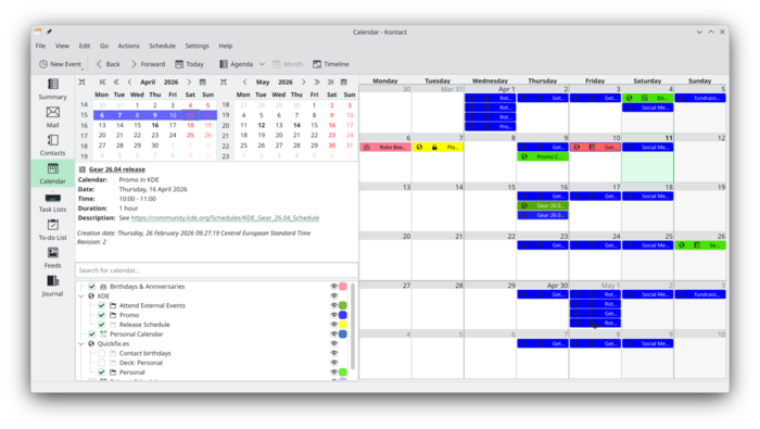 После четырёх месяцев разработки представлено апрельское сводное обновление приложений KDE Gear 26.04, развиваемых проектом KDE. В составе набора опубликованы выпуски более 250 программ, библиотек и плагинов. Информацию о наличии Live-сборок с новыми выпусками приложений можно получить на данной странице. Новые версии отдельных приложений можно загрузить из каталогов Flathub и SnapCraft.
